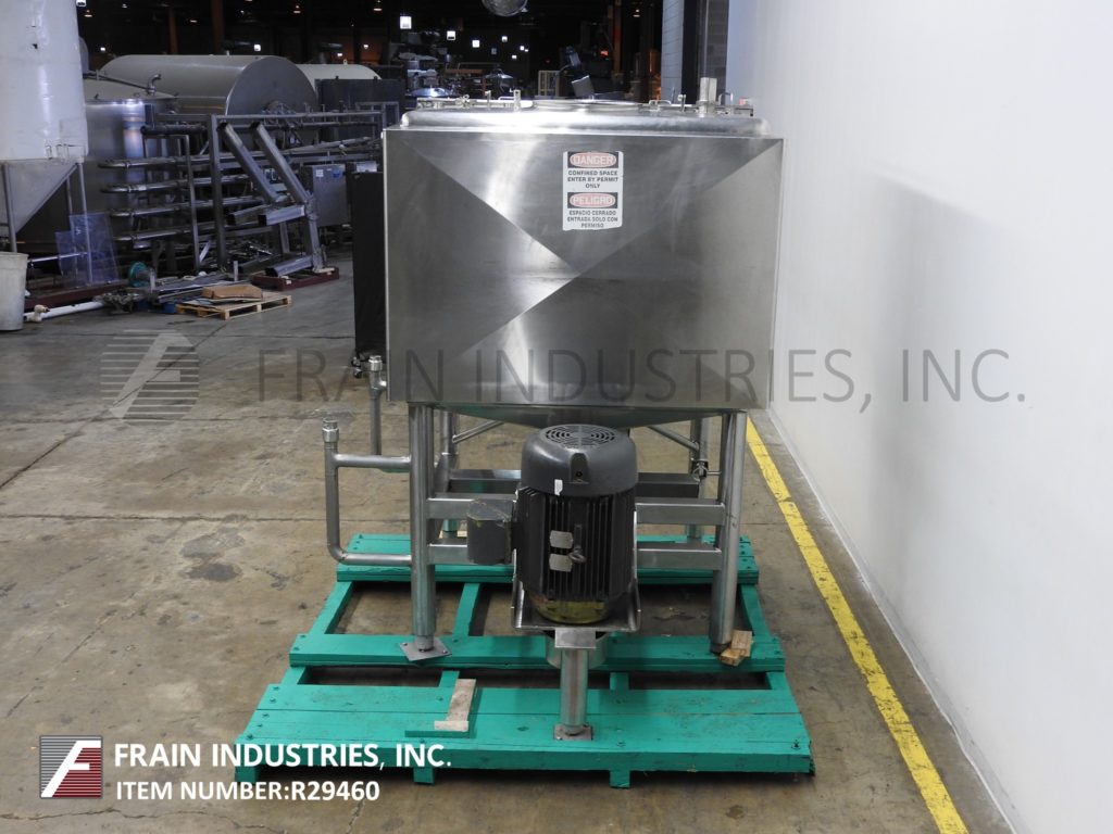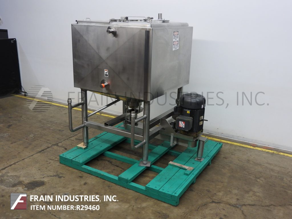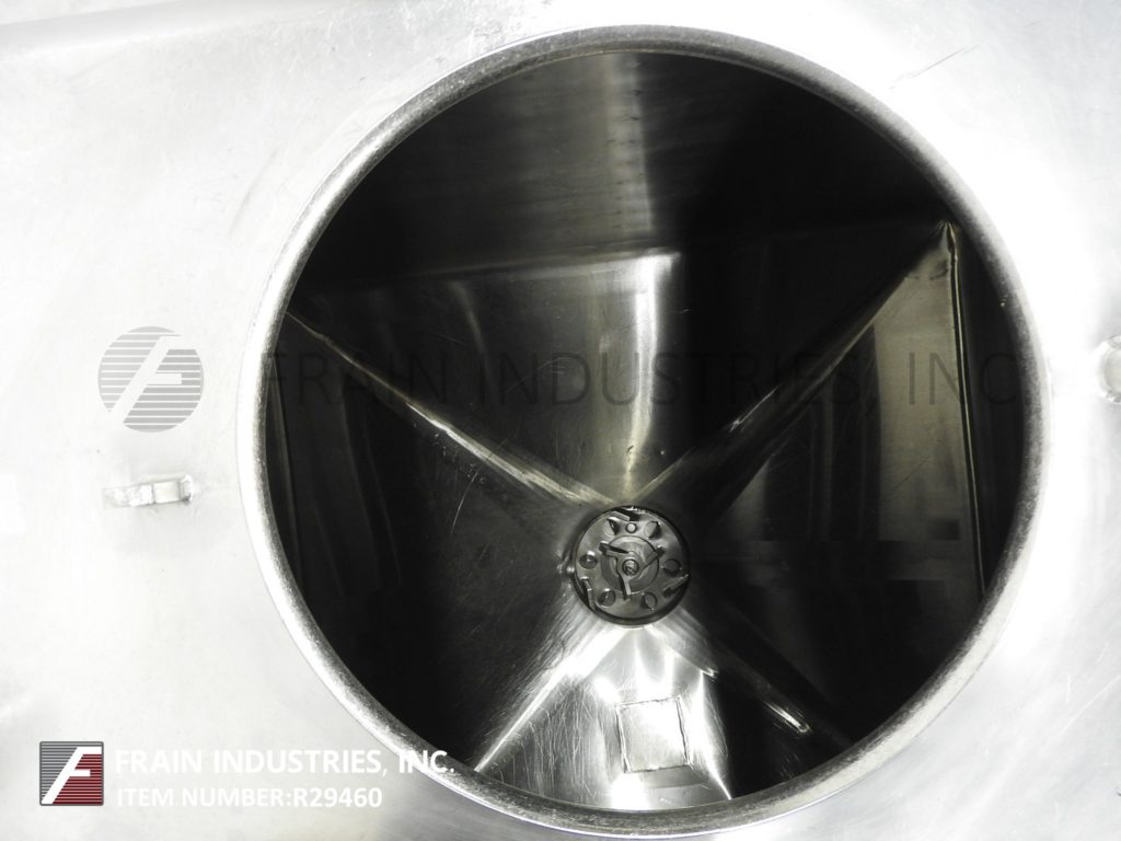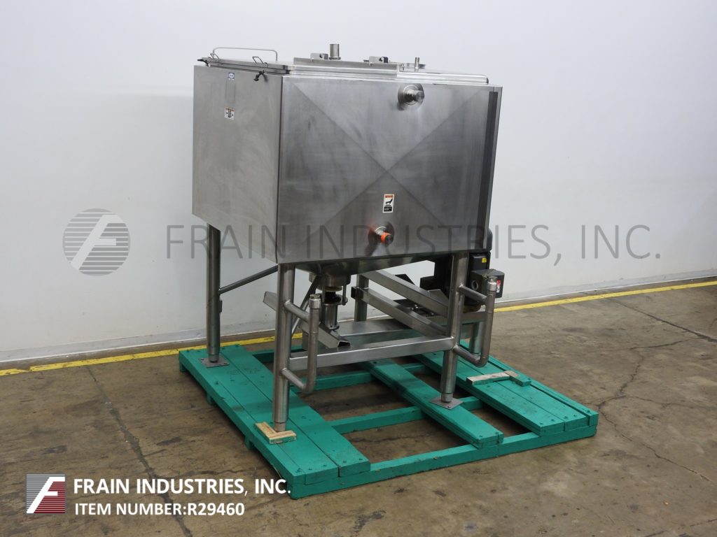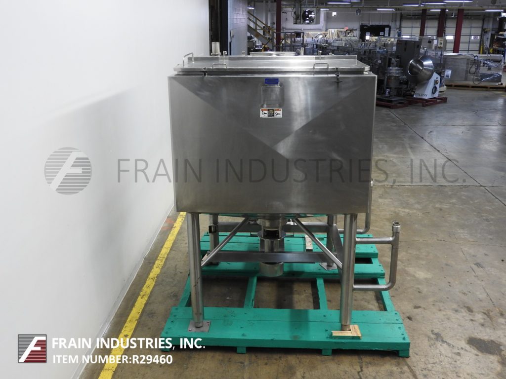 返回所有设备Walker型液体混合器,750加仑,316L不锈钢结构高剪切,夹套液化器每小时产品加仑数-取决于材料和应用。腔室尺寸:63英寸长;63年“宽;47“直墙;27"锥形底。配备18" ID人孔,带翻转顶部螺栓下盖和62"宽翻转顶部盖。锥底带有12”外径高剪切6孔/ 3翼型叶轮和3½”外径卫生中心底部排料口,具有36”地板间隙和带启动/停止按钮的控制箱。安装在不锈钢管状底座上。