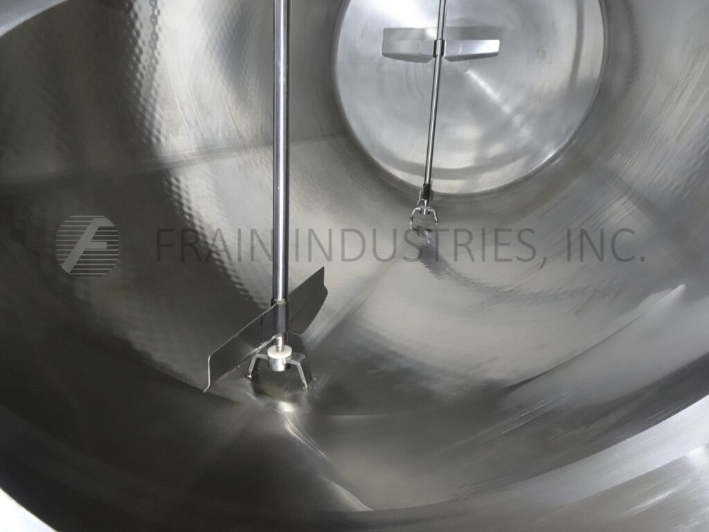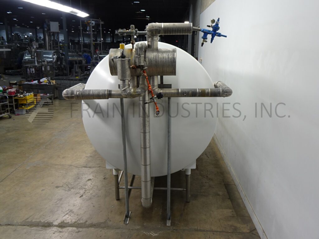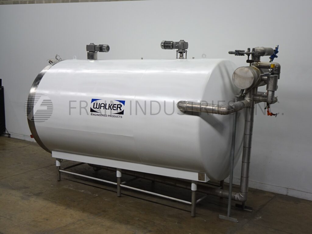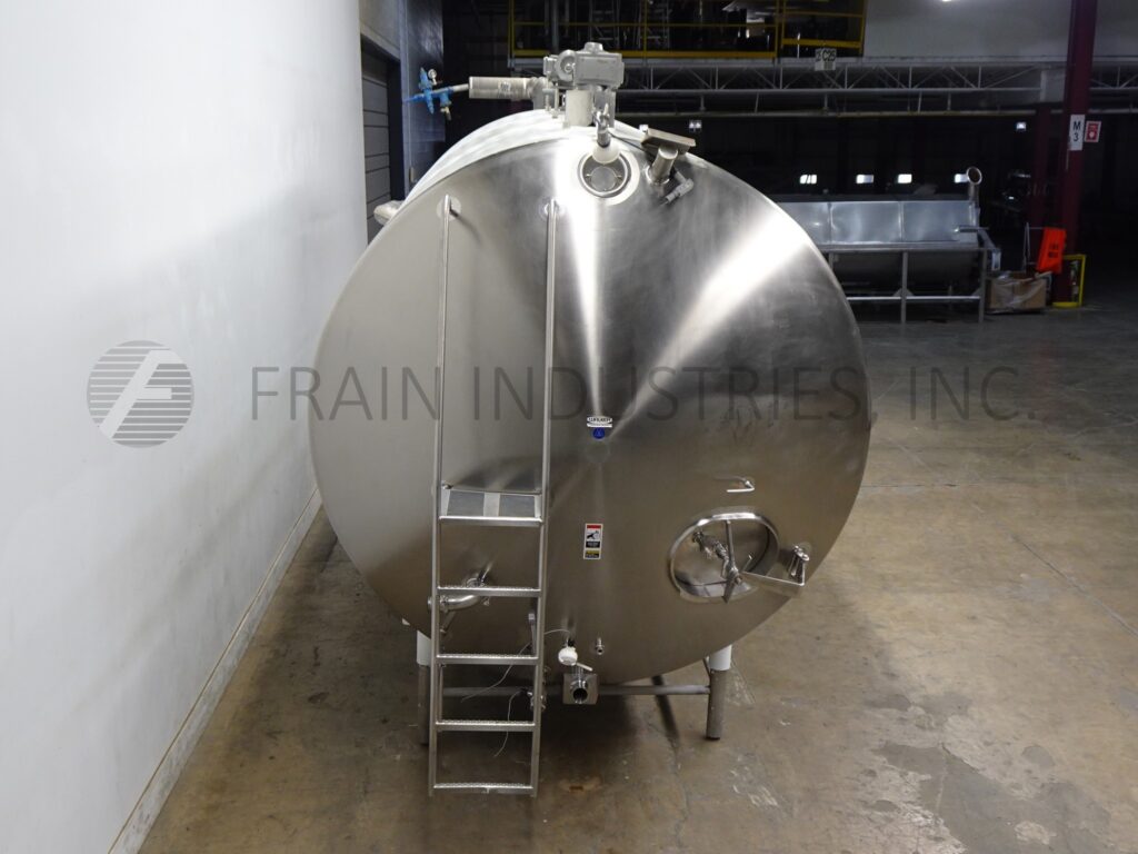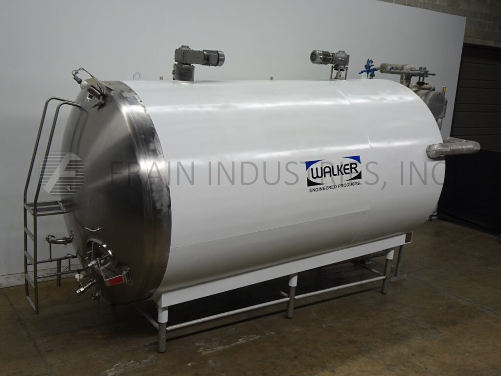 Back to All EquipmentWalker, Model HHT, 6000 Gallon, 316L Stainless steel, horizontal, jacketed, processing tank. Has vessel Dimensions of: 106" in Diameter; x 180" Straight wall. Equipped with 19" x 16" manway with bolt down cover, 3½"OD / 3" ID Tri-Clamp side inlet, top mounted (2) 3 Hp prop agitation and (3) CIP spray balls supplied by a 2"OD / 1½" ID Tri-Clamp fitting, 4" observation opening, thermowell, (2) top mounted paddle mixers and 3½"OD / 3" ID side discharge with 19" ground clearence. Mounted on (6) stainless steel legs and access ladder.