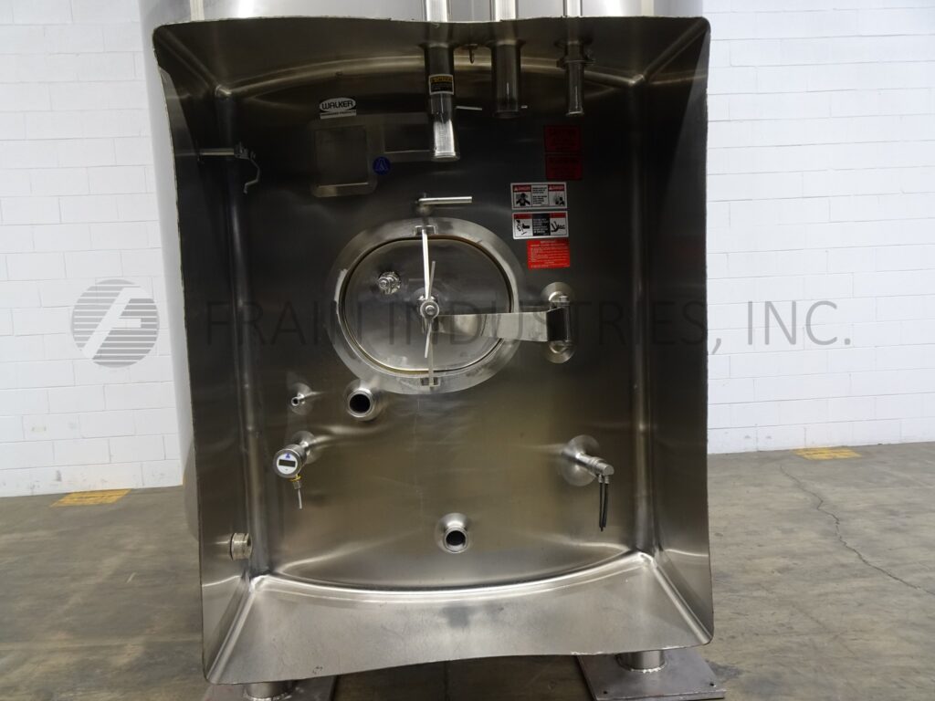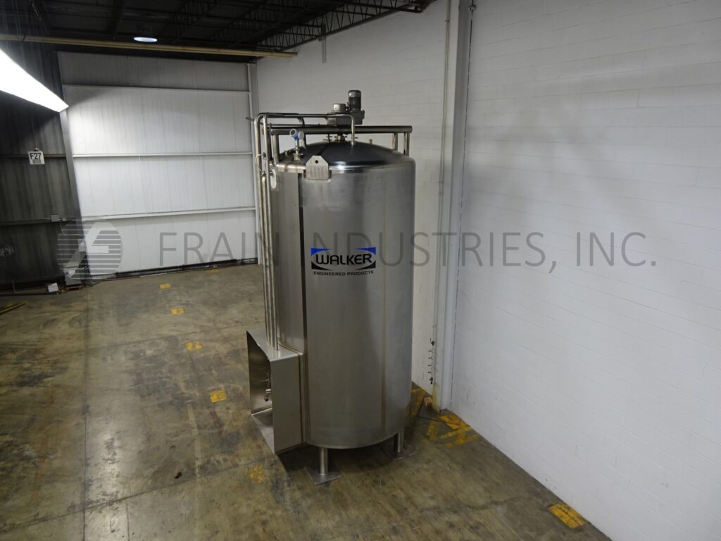 回所有设备Walker3500加仑容量 304不锈钢加工厂船尺寸:82直径,162直墙,14x20人行道配有侧锁盖、顶架5HP扫波扰动、2热井、1fet安装传感器和2cp喷雾球倾斜底部3OD/2