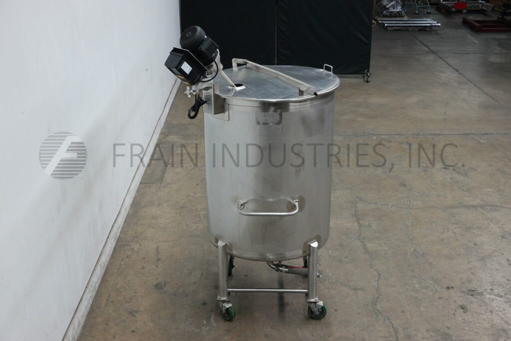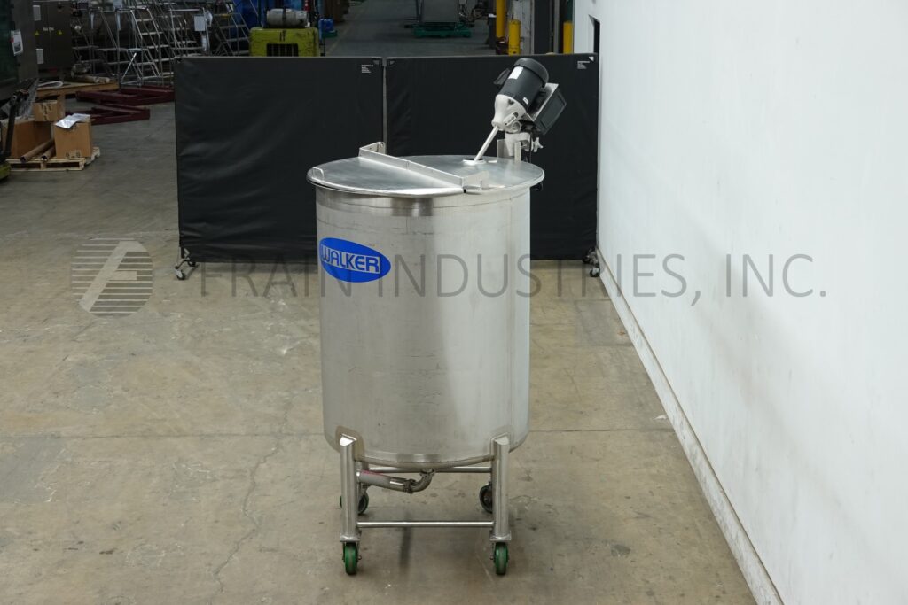 Back to All EquipmentWalker, 250 Gallon, 316 stainless steel, single wall tank. Vessel dimensions: 36" OD; 50" Straight Wall. Flat top with dual flip top covers and side mounted prop style mixer. Dish bottom with 2-1/2" OD sanitary center bottom discharge with ball valve and 16" floor clearence and mounted on (4) stainless steel legs with casters.