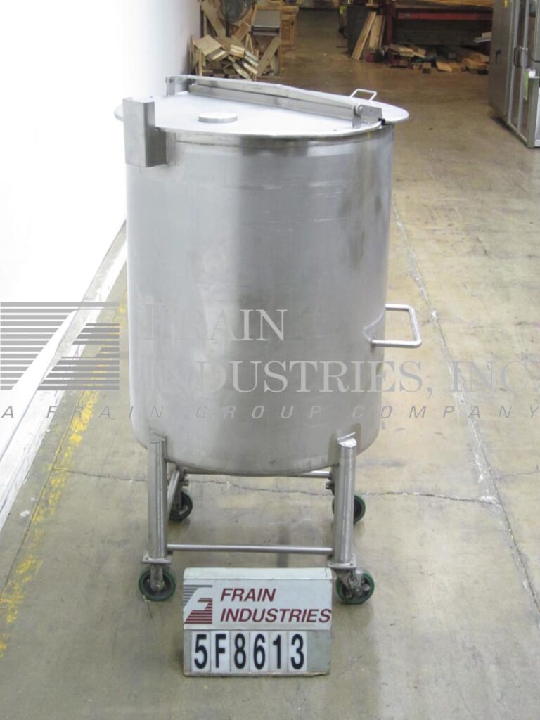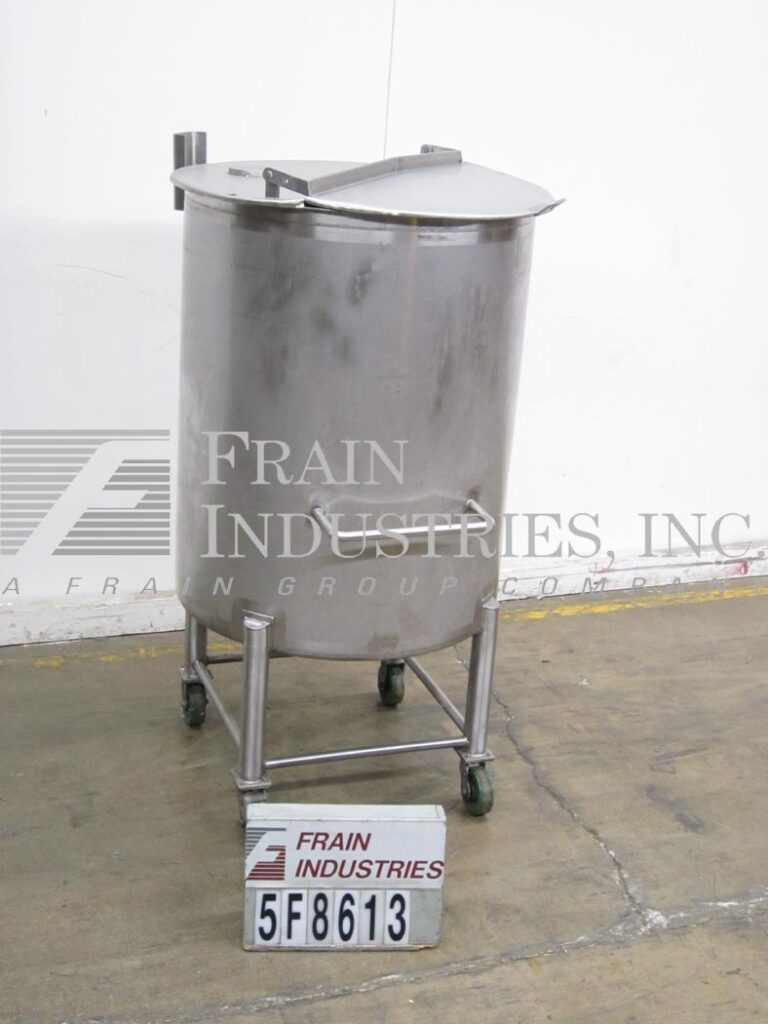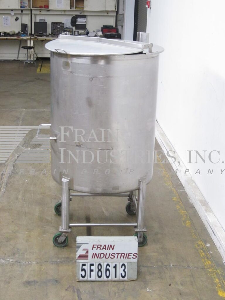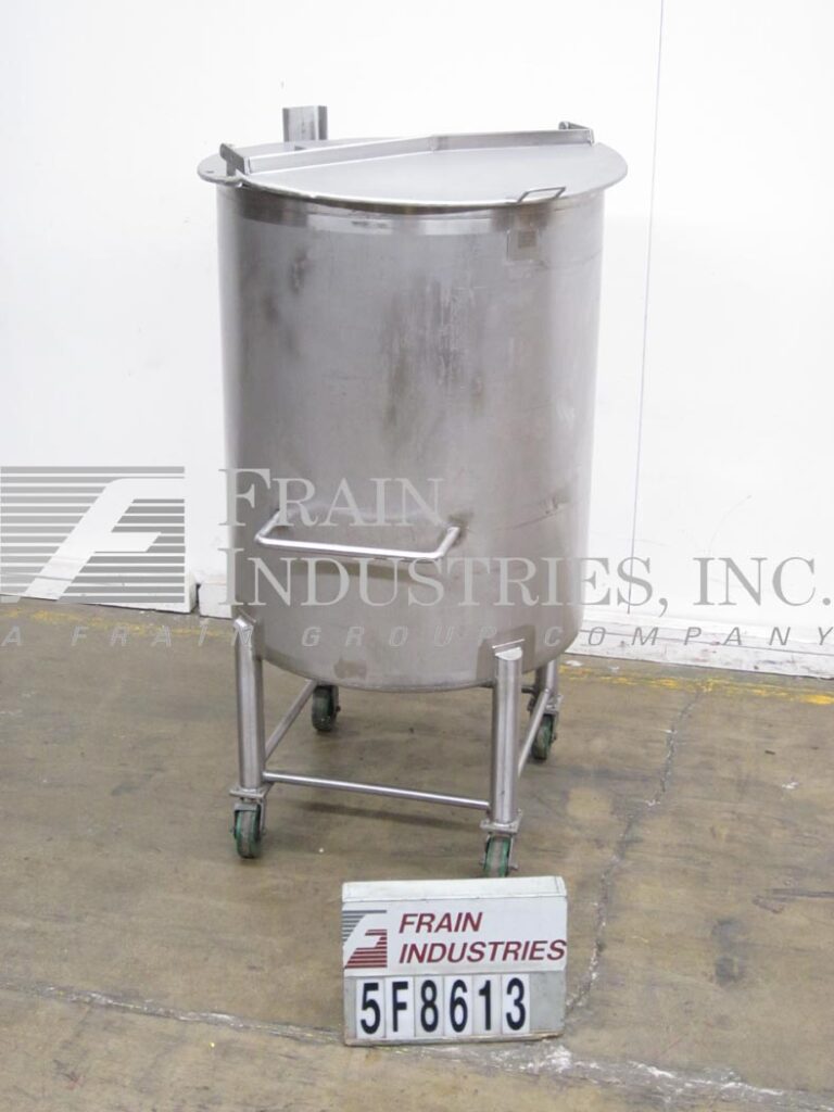 沃克,250加仑,316不锈钢,单壁水箱。容器尺寸:36”外径;50“直墙。平顶与双翻盖盖。盘子底部2-1/2”OD卫生中心底部排放与球阀和16”地板间隙,安装在(4)不锈钢腿与脚轮。