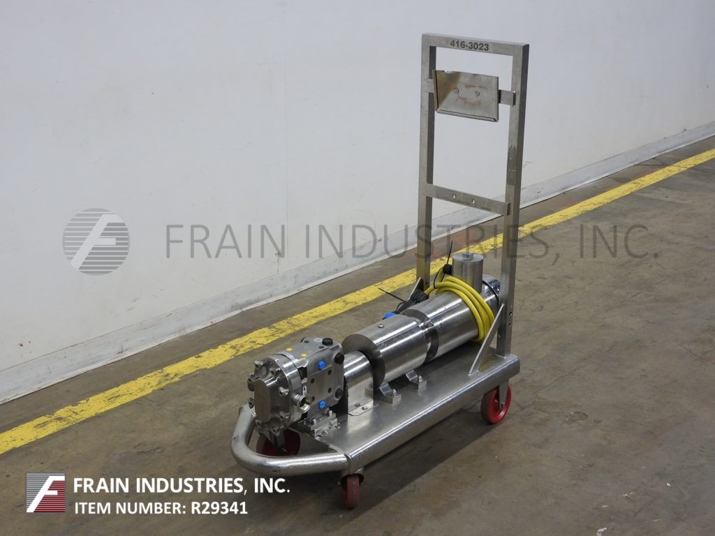 Waukesha, 15型容积泵,316不锈钢接触部件。额定产品每分钟1至10加仑-取决于材料,应用和机器配置。200psi最大工作压力,温度范围-40℉至200℉标准和高达300℉热间隙转子/定子和viton密封,可顺时针或逆时针操作。配备2" OD / 1½" ID三钳式产品充放电11"地间隙。由一个2马力驱动的变速控制器和一个3:1的齿轮比,最大电流速率为7.5加仑/分钟。安装在45英寸长x 18英寸宽不锈钢推车。
