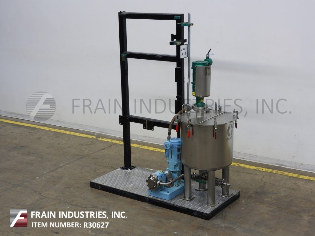 返回所有设备40加仑不锈钢混合罐和泵系统。配备24英寸“直径X 24”深搅拌罐,带有20英寸的直壁,翻转盖和7“直径支柱搅拌,由A(1/3)HP驱动器提供动力。混合罐排放到Waukesha型号15个正排量泵,由1½HP驱动器提供5:1比率齿轮箱,用于电流最大流速为4.5Gpm。安装在30“x 70”平台上。