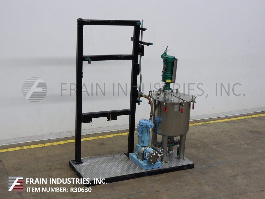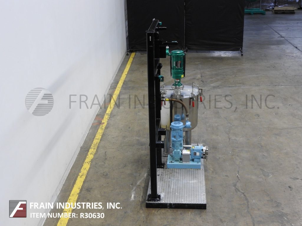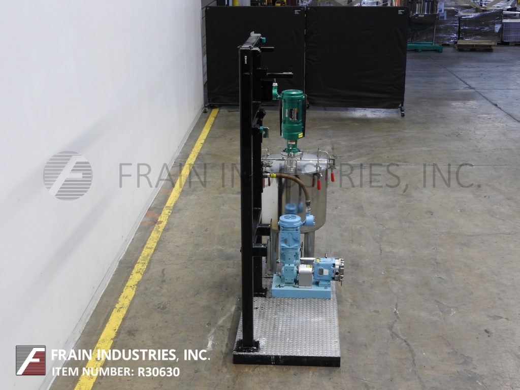 返回所有设备40加仑不锈钢混合罐和泵系统。配备24英寸“直径X 24”深搅拌罐,带有20英寸的直壁,翻转盖和7“直径支柱搅拌,由A(1/3)HP驱动器提供动力。混合罐排放到Waukesha型号15个正排量泵,由1½HP驱动器提供5:1比率齿轮箱,用于电流最大流速为4.5Gpm。安装在30“x 70”平台上。