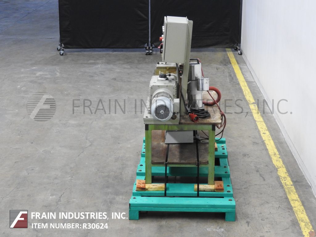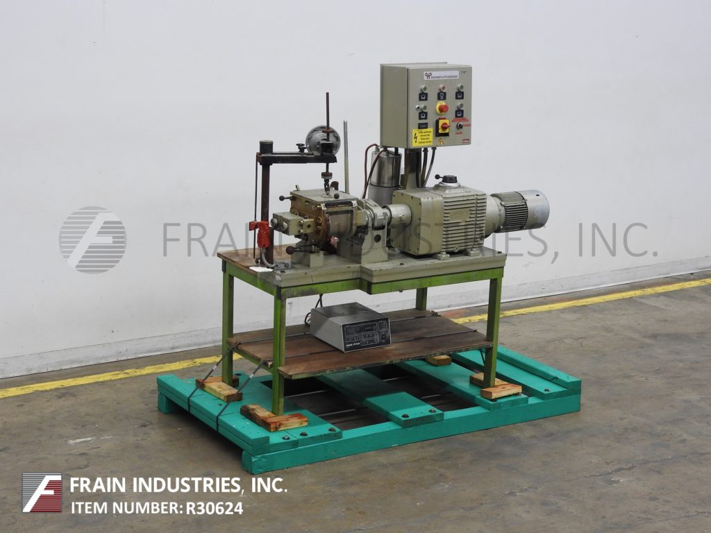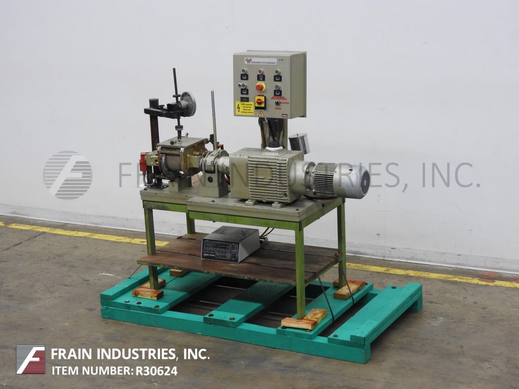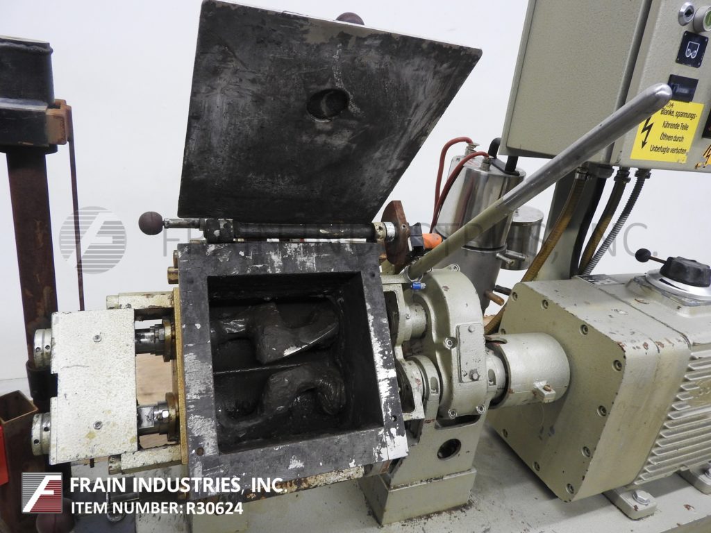 返回所有设备Werner & Pfleider,型号0.1立方英尺(3 / 4加仑)的工作容量,316不锈钢,夹套,双臂,sigma叶片搅拌机,每小时产品磅数-取决于材料和应用。内部混合室尺寸:6½“长度;6¾”宽;深度6”。配备不锈钢接触部件,3马力电机驱动,手动倾斜32"放电高度和¼" NPT连接低压夹套。安装在涂漆的底座上,带有按钮启动/停止控制和前进/后退开关。