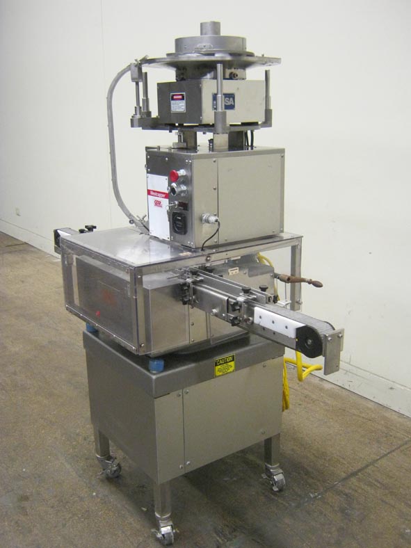 返回所有设备自动,铝盖封口机额定速度为40至120厘米 - 速度取决于材料和应用。帽尺寸范围:11mm - 38mm,集装箱尺寸范围:直径3mm - 89mm x 30mm - 241mm高度可运行标准偷窃,衬里血清,撕开/翻转1 - 3件封闭,固体铝盖,以及特殊封闭(具有适当的变化部件)。配备振动帽料斗,12个口袋旋转容器搬运车轮,3个旋转滚筒密封系统,64“长x 2-1 / 4”宽不锈钢网带式输送机。控制面板带开/关开关,电子停车输送机和箱速控制拨盘,盖探测器,带读数和小时计的产品计数器,安装在(4)底座上,带锁定脚轮。