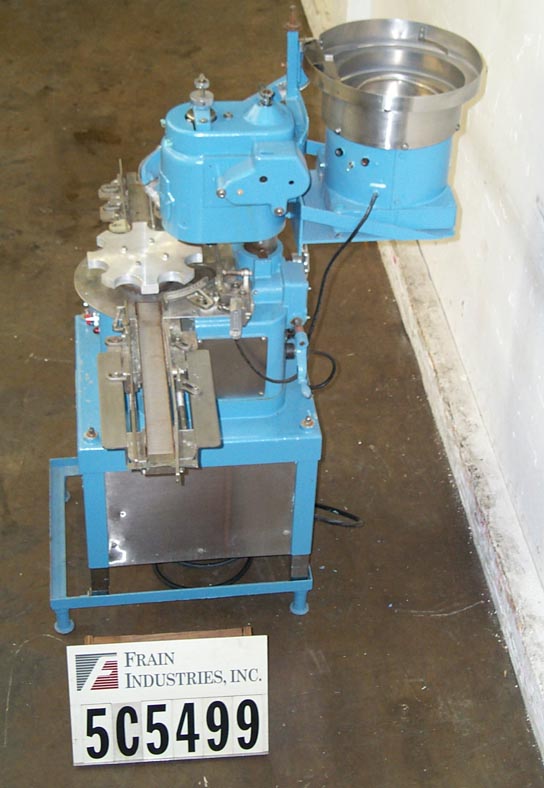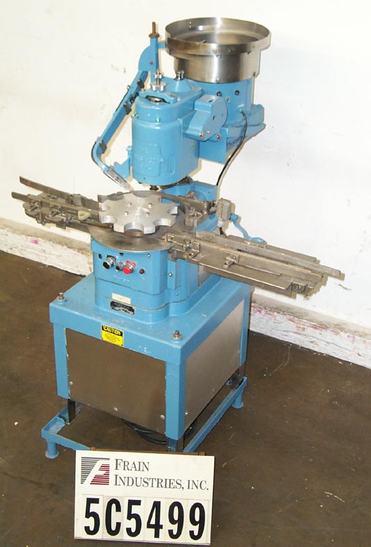 自动间歇运动压盖机,额定20至120 cpm,速度取决于材料和应用。容器尺寸范围:1/2"至3-1/2"直径;1-3/16" - 8"高度。配有振动碗式进给装置和8个袖珍星轮。
