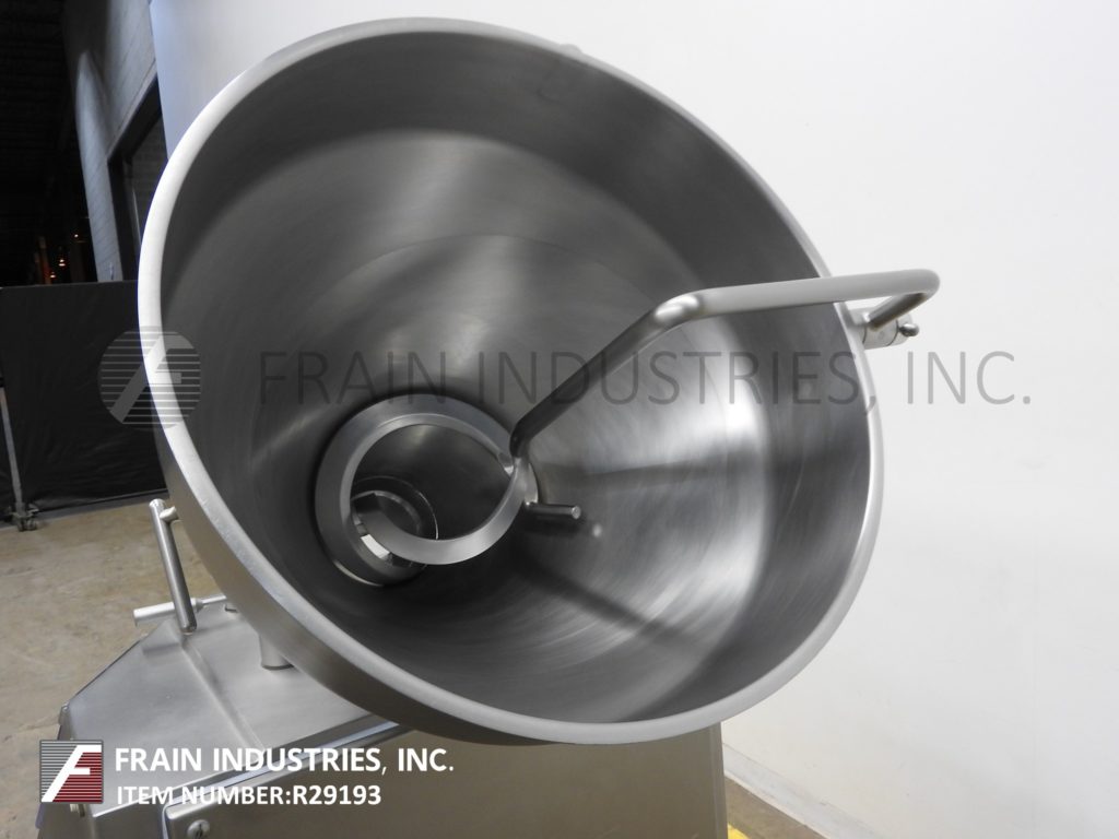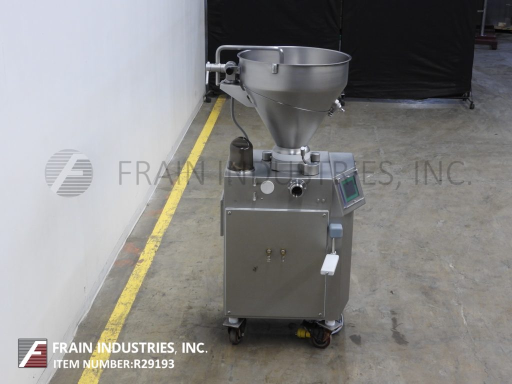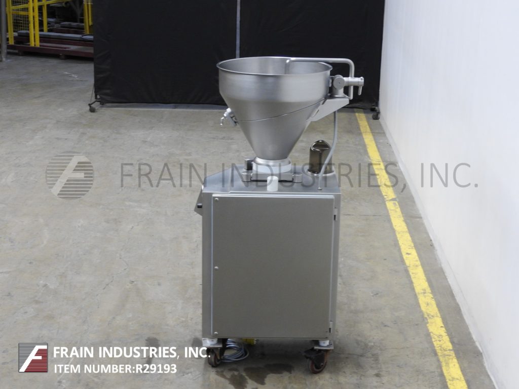 Back to All EquipmentVemag DP3, continuous, stainless steel, rotary vane pump, stuffer, portioner, designed for smaller quantities and easy cleaning (for frequent product change over) with pounds of product per hour – depending on materials and application. Weights from 10 to 200 grams. Equipped with 24" diameter x 24" deep tilt back divided product hopper with screw and side scrape, rotary vane product feed, vacuum pot, plug port and filter screen, knee level adjustment lever, vacuum pressure gauge, oil-less vacuum pump and 3" OD threaded discharge port with 40" floor clearance. Touch screen controller, portion and vacuum control dial and start / stop push buttons. Speeds dependant on materials, application and machine configuration. (Example: up to 140 portions per minute on a 10gm portion.) Mounted on casters.