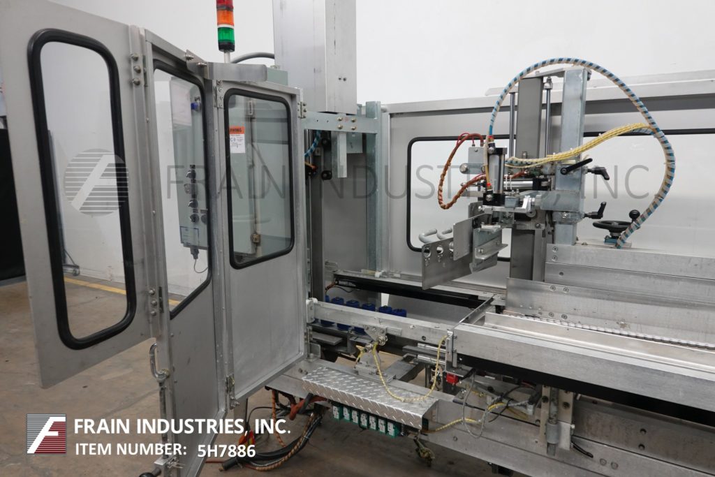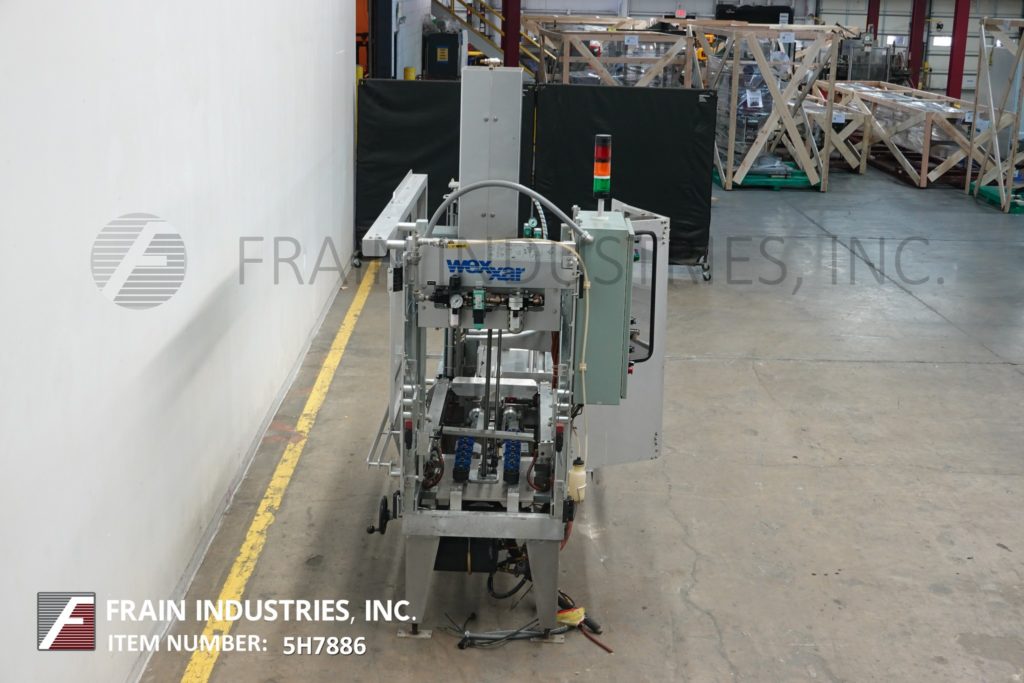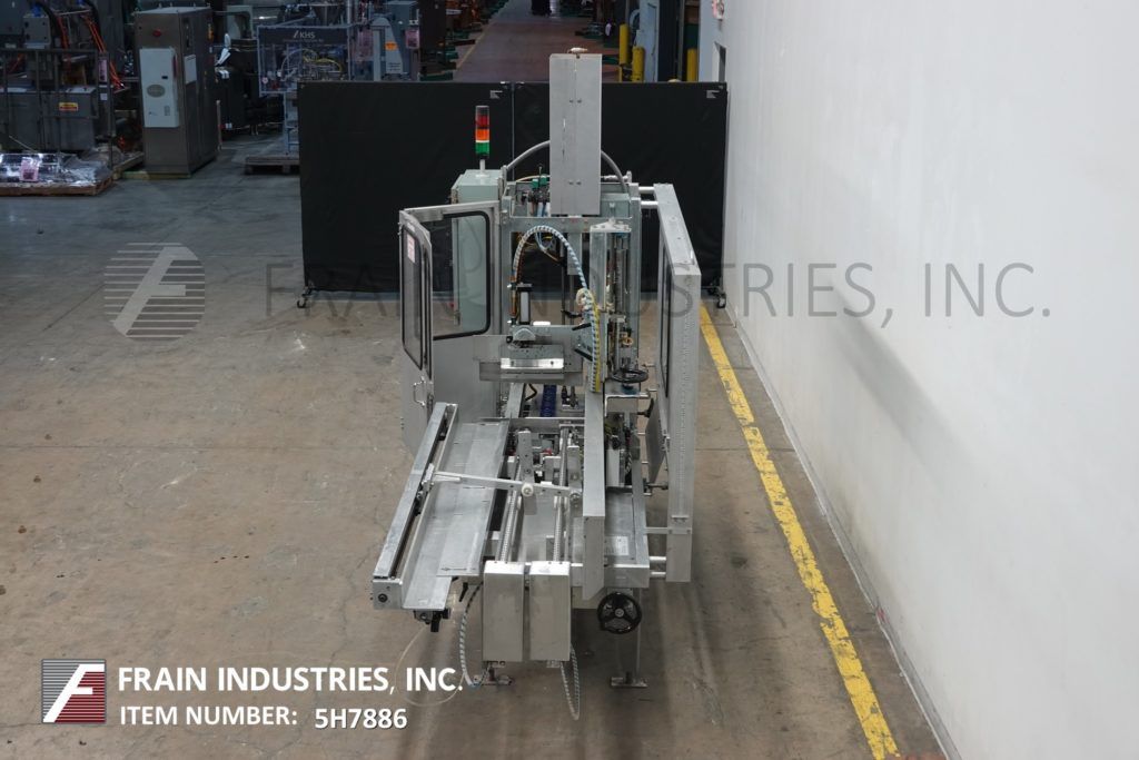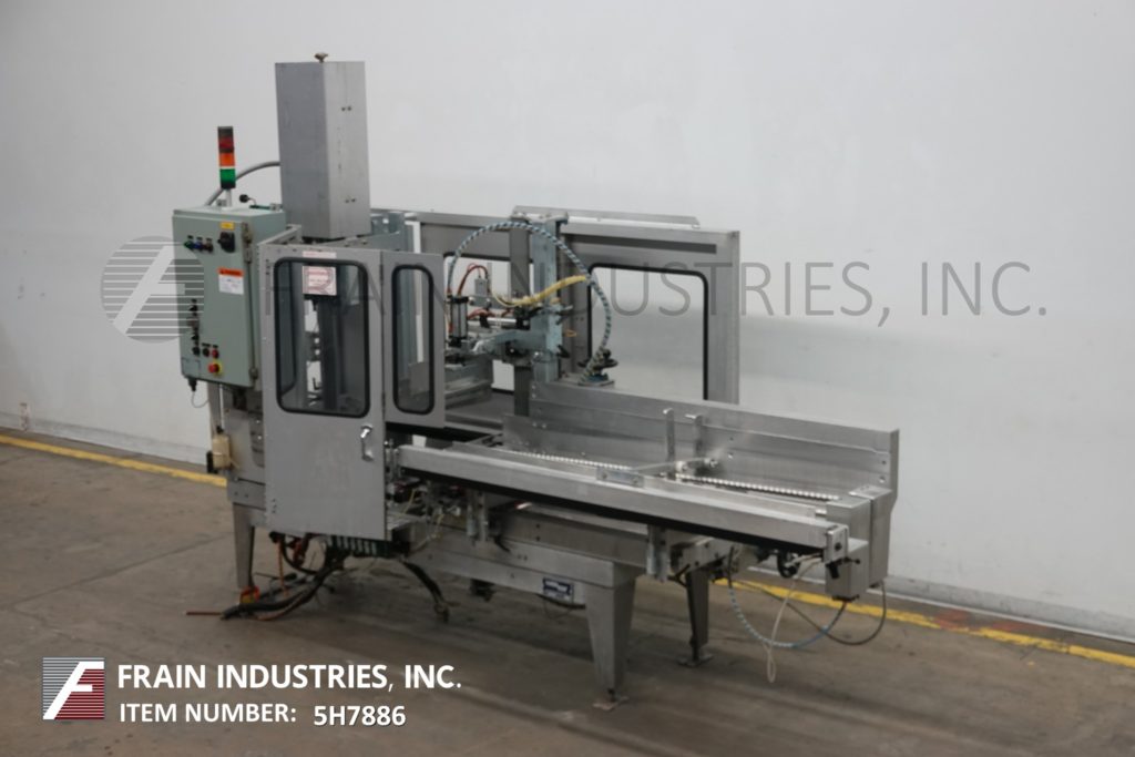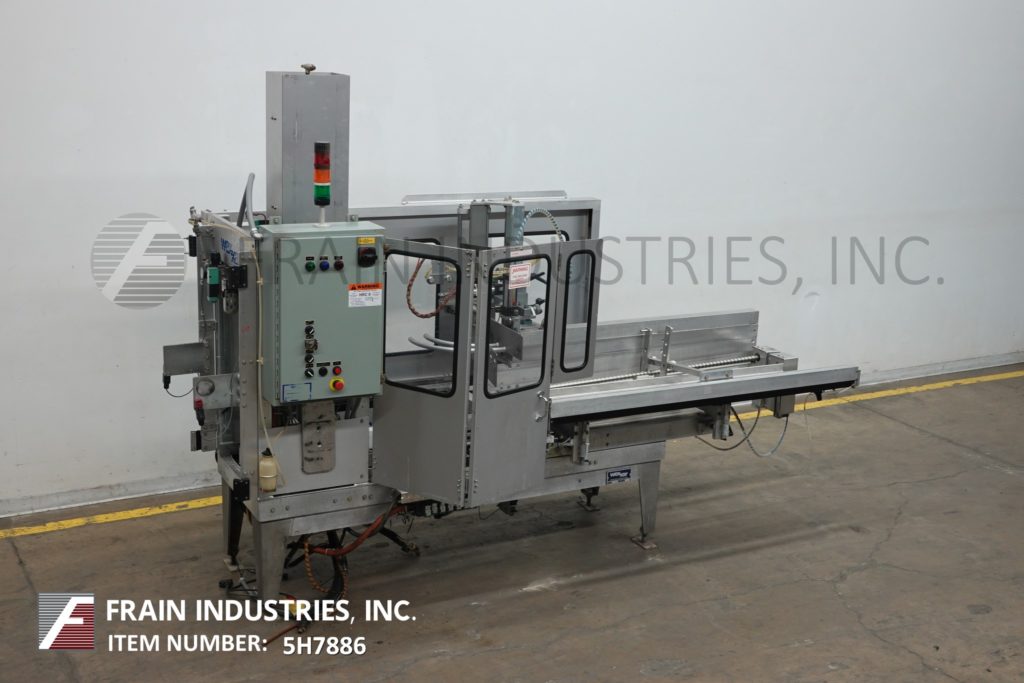 返回所有设备WFH型,自动,内联箱安装,底部热熔胶封口机每分钟有数量的箱-取决于材料和应用。外壳尺寸范围:6"至24"长度;5"至16½"宽度;3.5英寸到16½英寸的高度。配有70"长的动力空白盒杂志,往复销和圆顶的情况下形成板,小和主要皮瓣关闭,热熔胶系统,压缩夯和24"长的双侧滚子卸料段。A/B PLC,有滑枕臂,胶水,点动和运行控制开关,启动,停止和e-stop按钮,状态灯条和安全防护。安装在(4)有调平腿的腿架上。