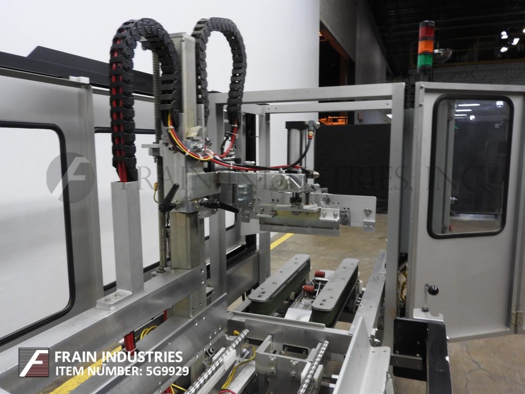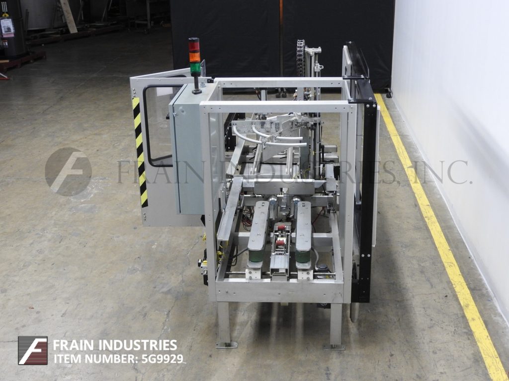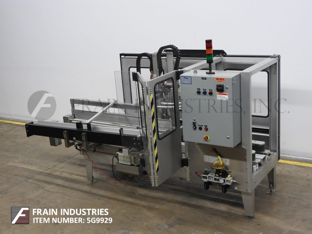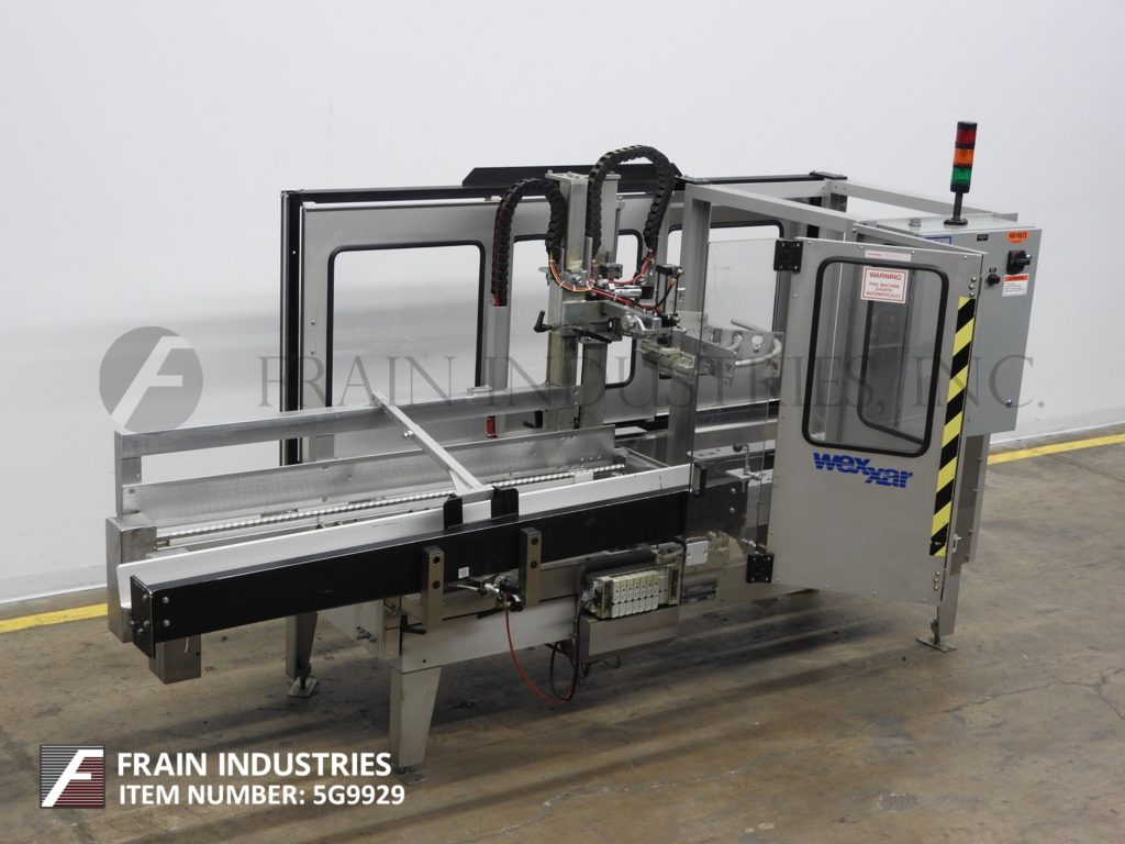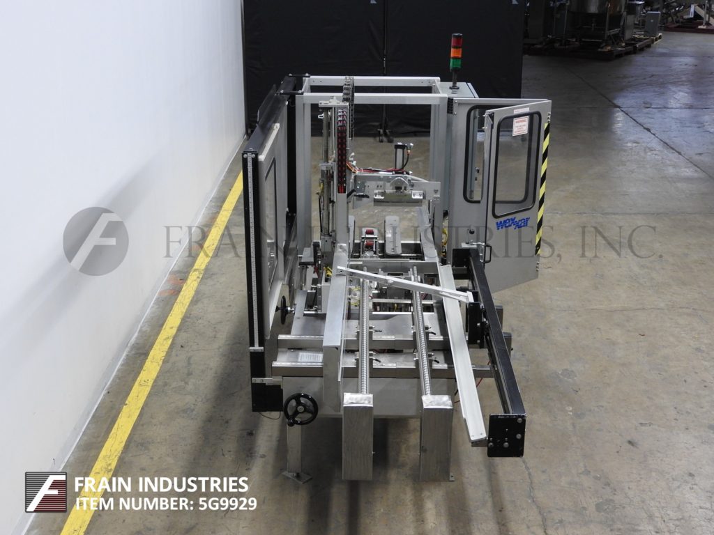 返回所有设备WF-2T型,自动内联箱安装和底部胶带封口机。每分钟5 - 25个病例-取决于材料和应用。外壳尺寸范围:7"至24"长度;宽度为5"至17";身高5英寸到12英寸。配备72"长动力空白盒杂志,往复销和圆顶情况形成板,小和主要皮瓣关闭,手曲柄高度和宽度可调,案件推杆,2" Dekka磁带头和32"长双侧皮带放电部分。控制面板有A/B PLC和按钮控制慢跑,启动,停止和e-停止。包括统计灯条和安全防护。安装在(4)带有调平支腿的支腿底座框架上。