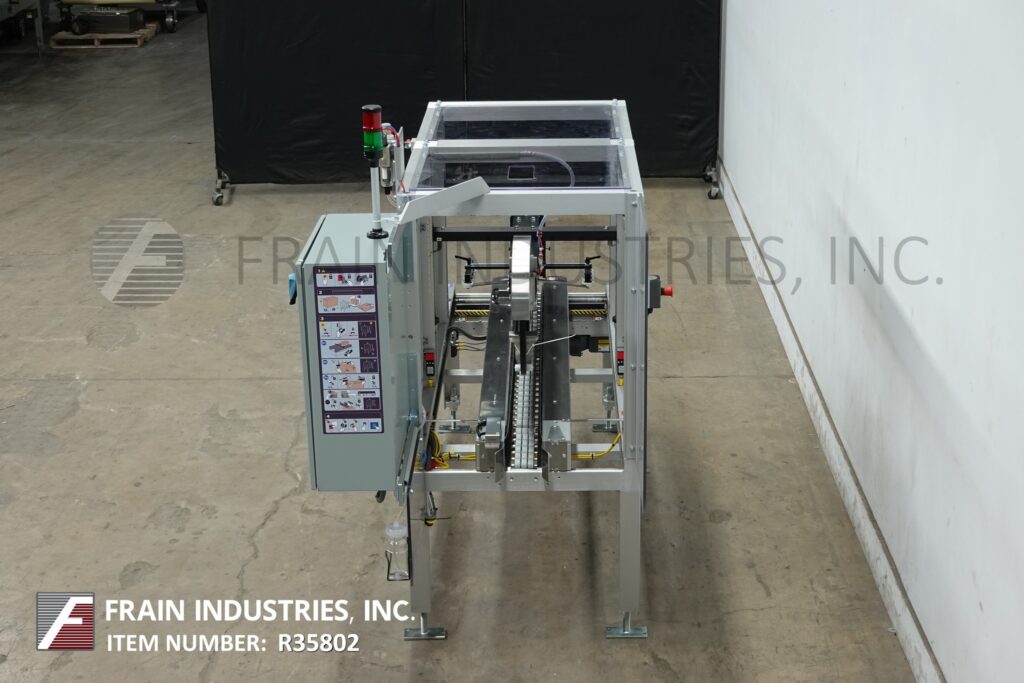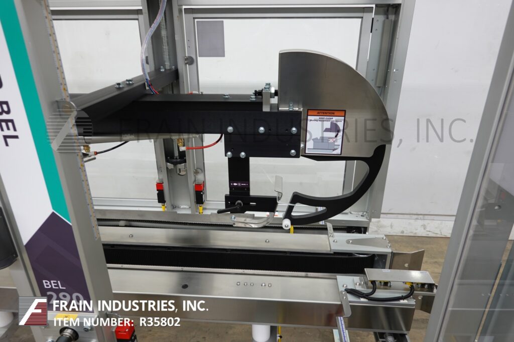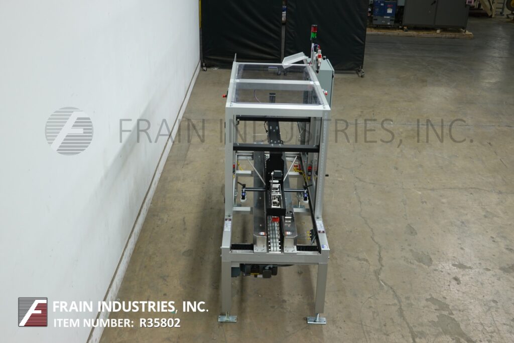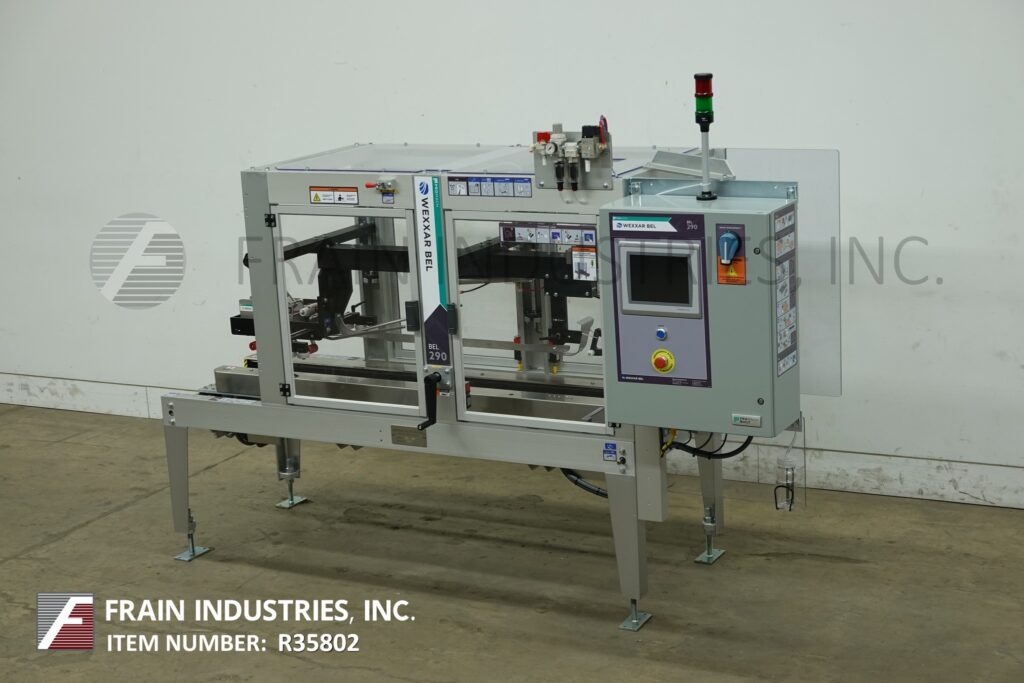 Back to All EquipmentWexxar, Model 290T, Automatic, uniform, top tape case sealer. Rated from 5 to 50 case per minute -depending on materials and application. Case size range: 8" to 32" in Lenght x 5¼" to 17½" in Width x 5" to 19" in Height. Equipped with (2) 80" Long x 3" high side case transfer belts, 2" Deka top tape head with adjustable height and width hand cranks. Control panel with touch screen HMI. Mounted on base frame with adjustable height legs.