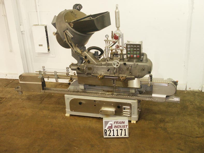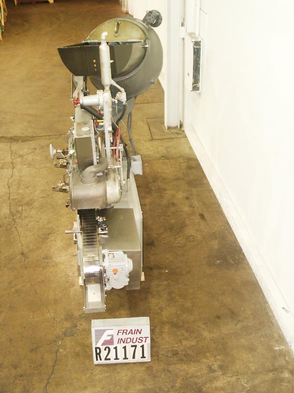 返回所有设备白色帽,全自动蒸汽真空密封夹具每分钟140至350罐 - 取决于材料和应用,帽尺寸范围:27mm至110mm。容器尺寸:1“至6 3/4”OD x 1 3/4“至11 3/4”高。配有安装在GR17D-1476引脚型盖送料器上的封盖器,专为RT和LT类型的金属和塑料盖(没有篡改带的塑料盖)和130“长x 4-1 / 2”宽不锈钢Dellon皮带输送机,22" Long x 25" Wide cap hopper, with cocked cap signal system and 32" OD cap feeder wheel. Machine displaces container’s headspace air with steam producing a vacuum and has efficiencies up to 26 inches Hg. Mounted on heavy duty frame.