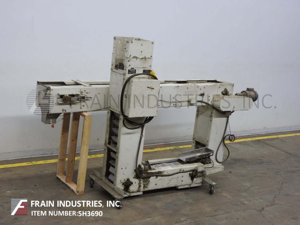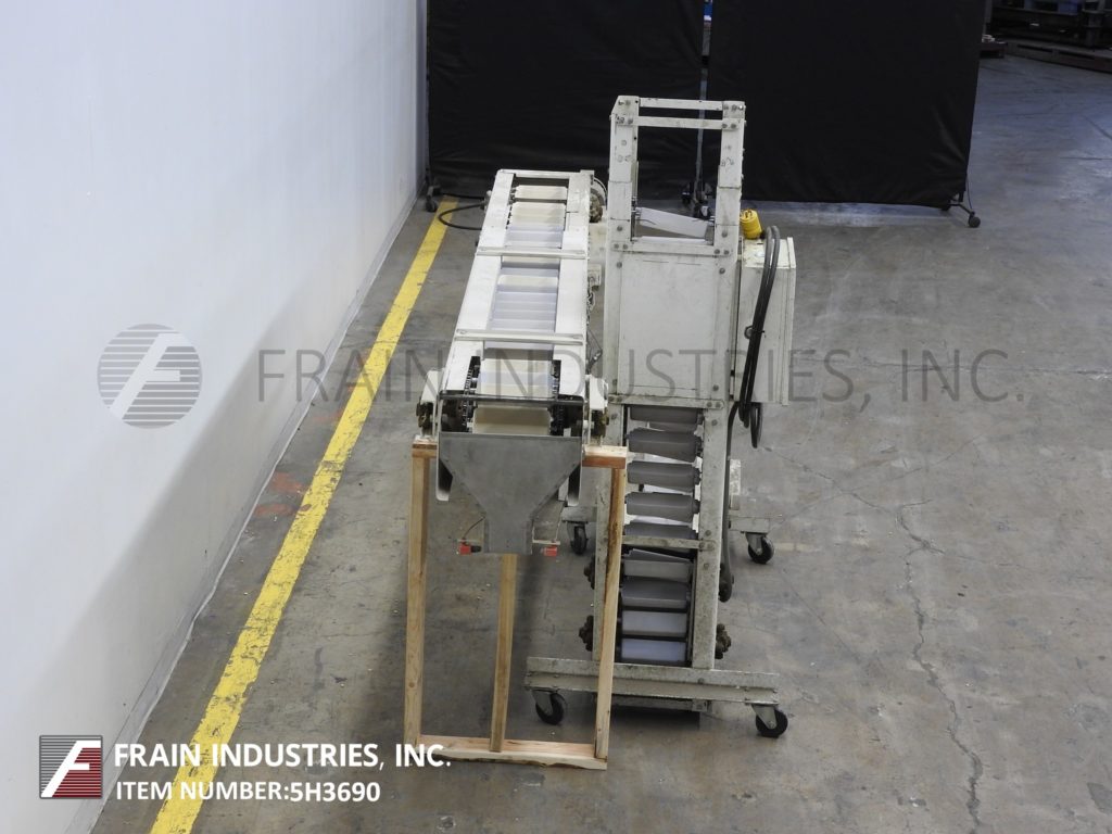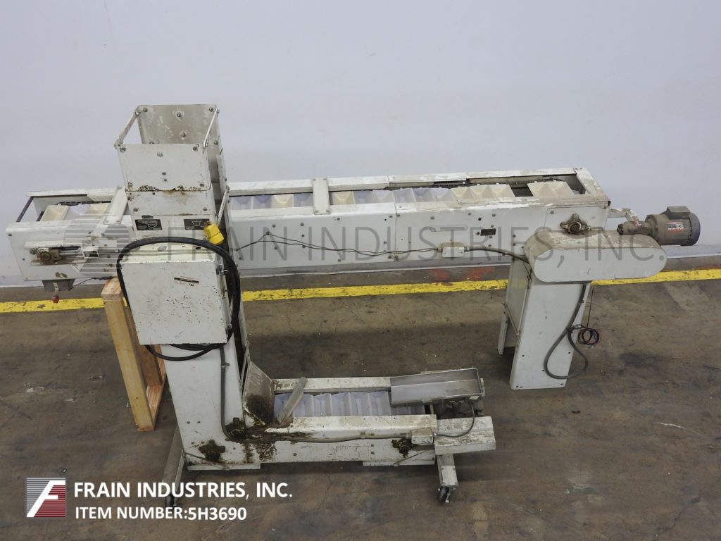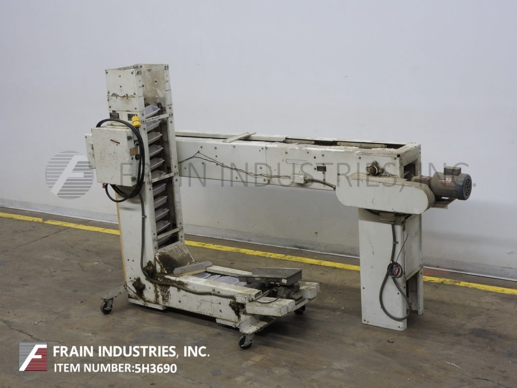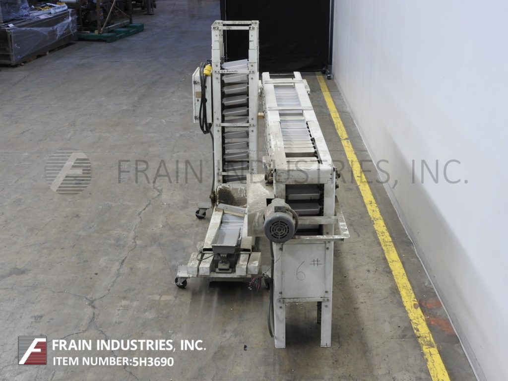 返回所有设备Z型斗式提升机。每小时产品的磅数-取决于材料和应用。配备白色塑料产品桶内尺寸4“长x 8“宽x 2“深度和36“长水平地板上运行一个13”饲料高度“垂直起降的13个“广泛的框架,到96年“开销水平上运行,5 x 5”卸料漏斗95”卸料高度。动力由0.33马力侧安装电机驱动器与变速控制器。安装在重型基础框架。