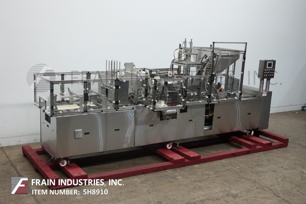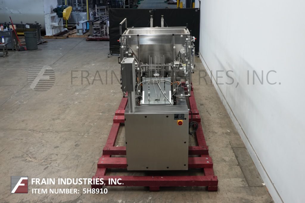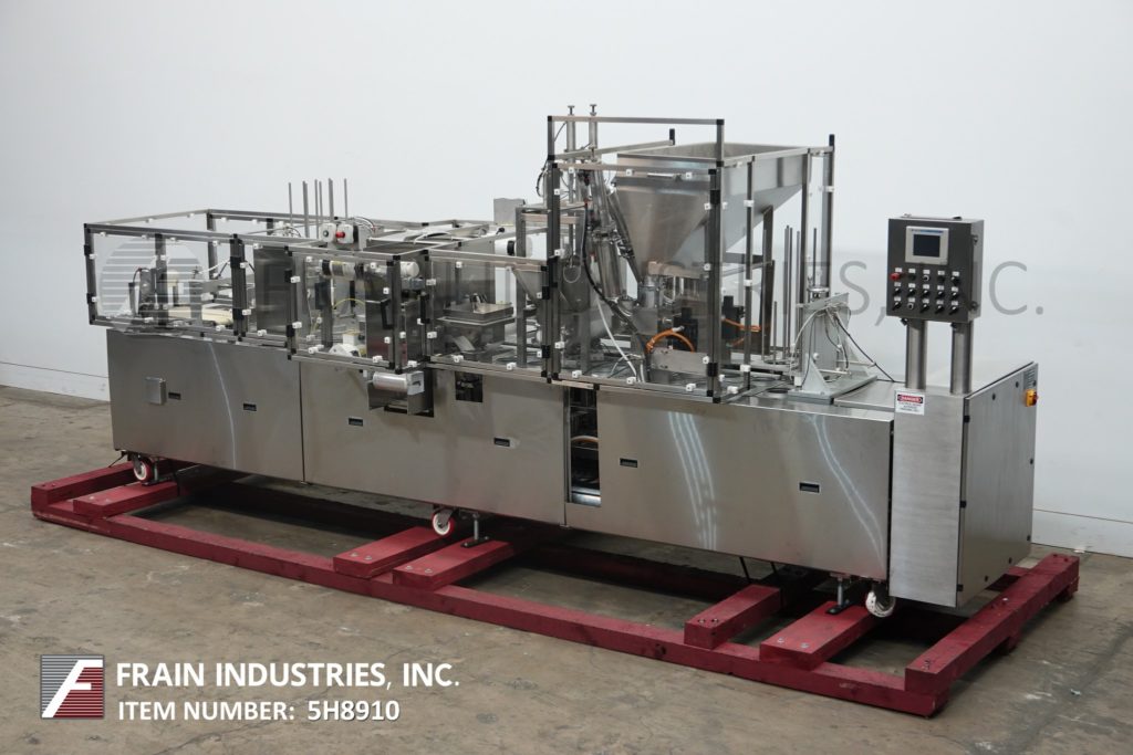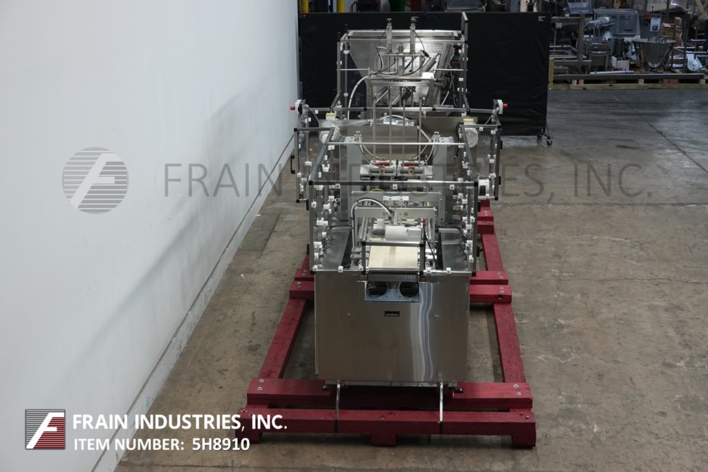 返回所有设备世界杯,自动,直列,2车道,不锈钢,杯填料与卷料薄膜涂敷器,热封口机和覆盖的数量容器每分钟-取决于材料和应用。配备24“长空容器杂志与denesters,输送机和有7“长x 15½”宽的载体板(2)跨5½“OD口袋设置在8”中心。37 * 20 * 24“产品料斗(2)4”直径x 11“活塞,28”x 8“x 16”混合料斗(2)干ingrediants馈线与夹关闭填补底注包孔口,(2)2”宽的振动输送机进料,卷筒材料薄膜涂布和锯齿状的热封机刀片切断站和自动电影倒带,挑选和放置覆盖层和12“宽x 23”长卸料输送机。控制面板有A/B控制器,触摸屏人机界面。安装在重型框架和安全防护。