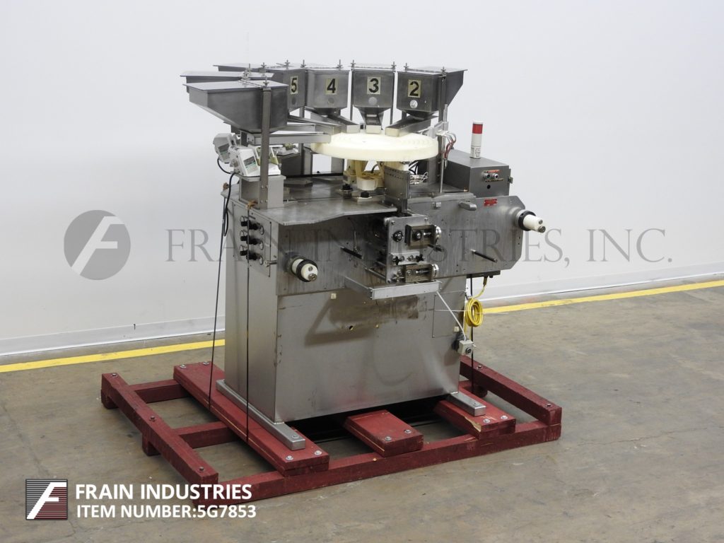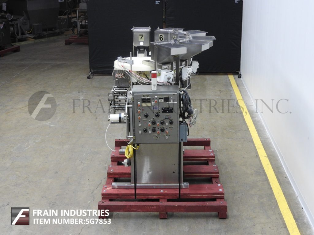 返回所有设备换档型号T-T,1-UP,垂直,形式,填充,4面密封,条带额定值从6至60袋/分钟级 - 取决于材料,应用,包装尺寸和每包件。封装尺寸范围:1“至6”的长度;1“至4”的宽度,具有适当的变化部件。配备(6)振动碗产品饲料料斗,双膜辊采用__“宽膜辊,胶片登记,孔打孔和低薄膜传感器。旋转切片刀片,带伺服驱动的刀具,目前与双单腔交叉设置和侧挖掘机和封口机。控制面板具有带面板视图和触摸板控制器的A / B CPU,触摸板控制器和振动送料器控制器,带快速拨号,Statis灯条和e-stop。安装在重型底座上。