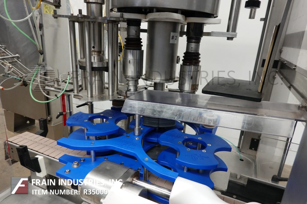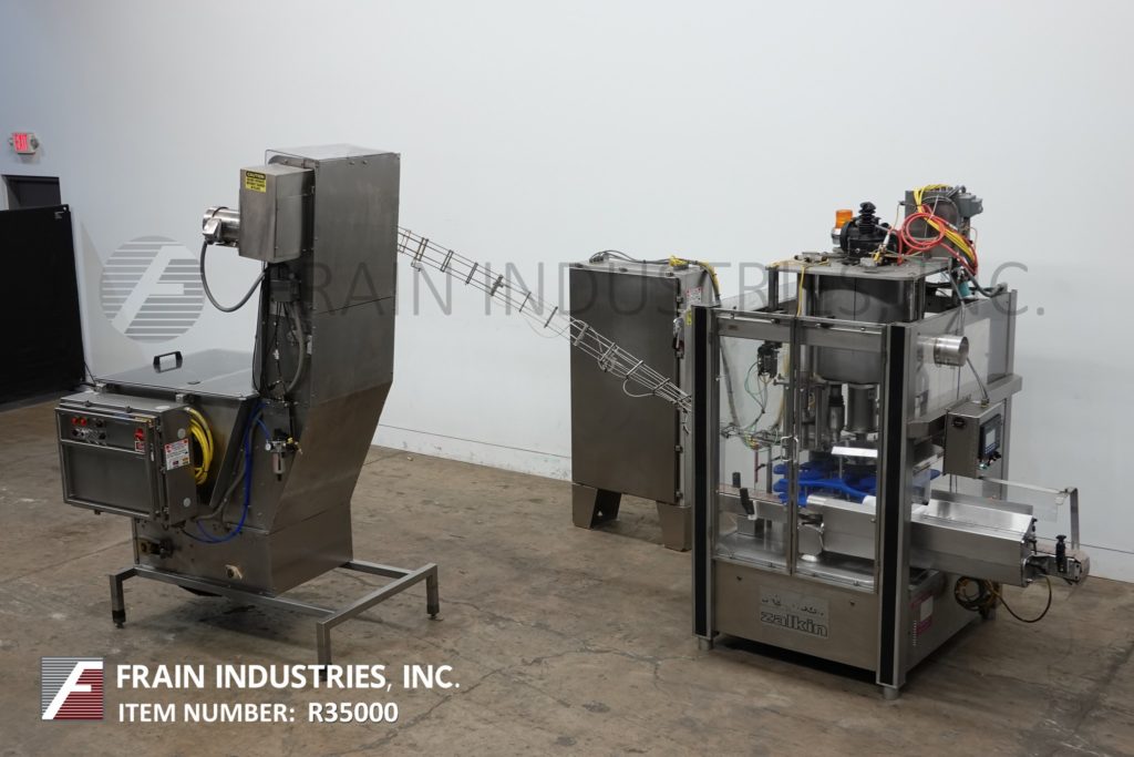 Back to All EquipmentZalkin, stainless steel, 3 head rotary chuck capper and feeder. Rated from 16 to 40 containers per minute – depending on materials, application and machine configuration. Equipped with waterall style cap sorter and feeder with 36" long x 42" wide x 36" deep cap hopper, 22" wide belt conveyor with cleats set on 5¾" centers and has 85" discharge height. Capper equipped with 4½" wide plastic delrin belt conveyor, worm screw to star wheel in feed, (3) head chucks set on 6" centers and star wheel discharge. Control panel has A/B controller and A/B touch screen HMI and start, stop, e-stop push buttons. Mounted on heavy duty frames.